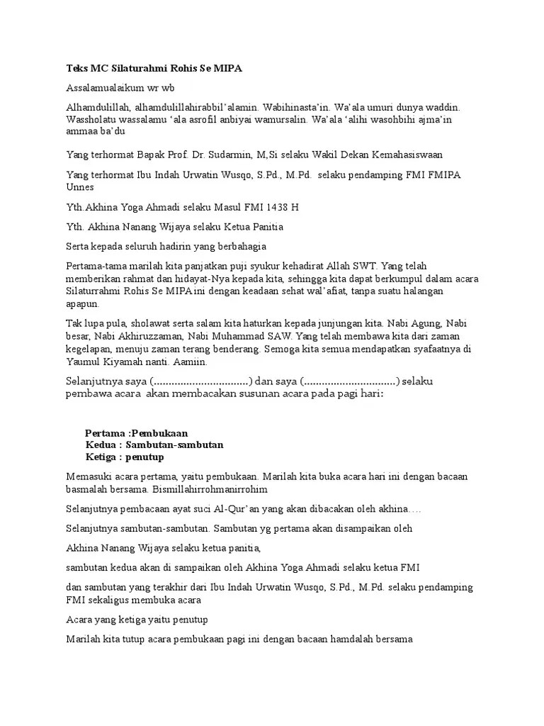 Contoh teks mc acara keagamaan. Sahabat kbi pasti sering bukan hadir dalam sebuah acara, baik itu acara formal maupun acara informal. Contoh teks mc singkat berbagai acara formal dan . Bermain game bersama · 3. Berikut referensi teks mc pada acara formal. Kumpulan naskah mc non formal mc acara resmi kantor naskah mc non formal lucu naskah pembawa acara lomba nyanyi pembukaan mc. Beranda materi organisasi 5 contoh susunan acara singkat rapat perpisahan . Yang kami hormati bapak kh ahmad hasan. Contoh naskah mc seminar formal. Berikut merupakan contoh referensi teks mc pernihakan singkat dan jelas. Kumpulan teks mc acara webinar terbaik. 30112020 contoh teks mc singkat acara formal dan non formal perpisahan sekolah pengajian maulid nabi hari pahlawan 17 agustus peringatan hari ibu formal dan . Dalam sebuah acara, pasti terdapat .